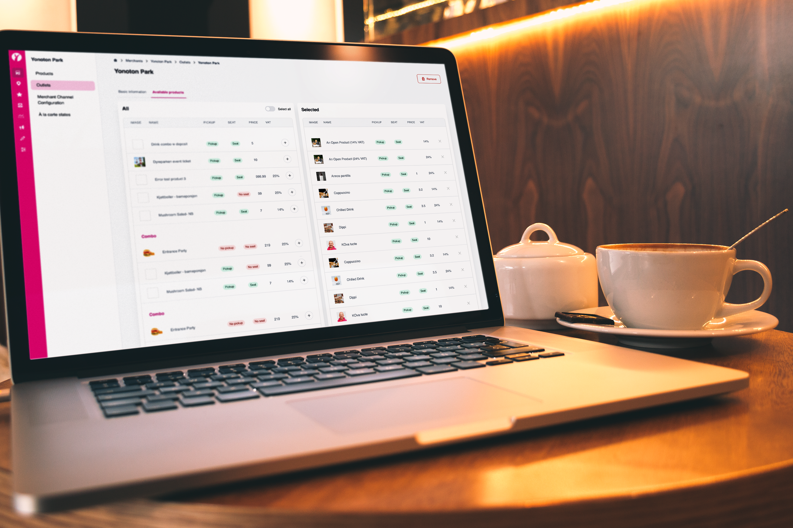User can manage everything single handedly from products on sale to menus, prices, discounts, happy hour or other special products, combos, images, allergens, inventories, recommended products and so on. Management console enables the user to manage all of Yonoton’s sales channels simultaneously.